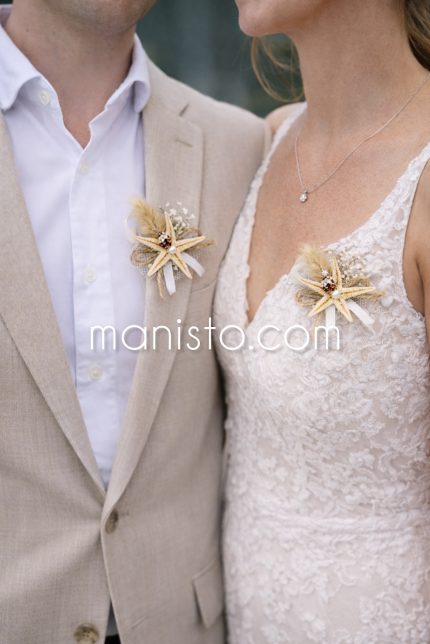 бутониери за гости, морска сватба, морски звезди, момина сълза