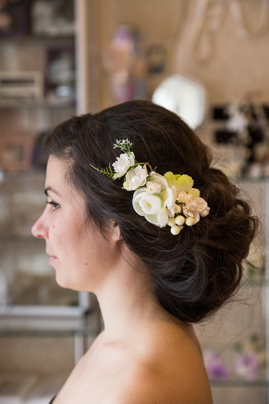 Аксесоар за коса, изработен от нежни цветя. Закрепя се за косата с гребенче, което го прави много удобен за всеки вид прическа. Чудесен  завършек за тоалета на младоженката или шаферките.