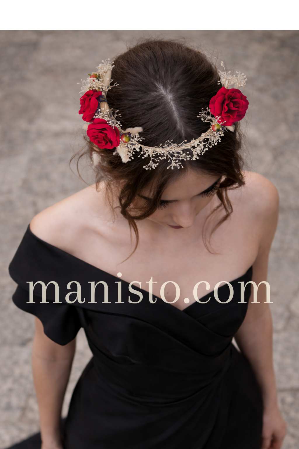 Венец от красиви червени рози – Ефектен и романтичен същевременно. Може да бъде завършек за тоалета на младоженката или шаферките й.