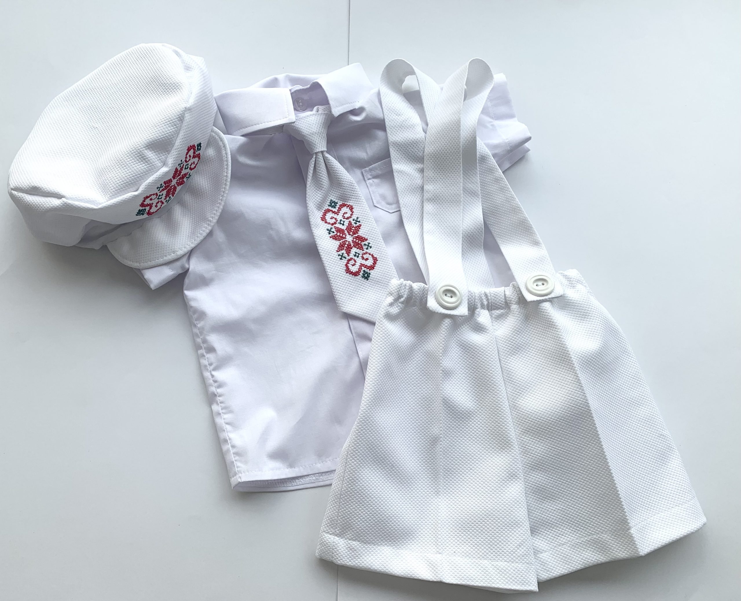 Костюм изработен от памучен плат. Украсен е с бродирани шевици на вратовръзката и шапката.