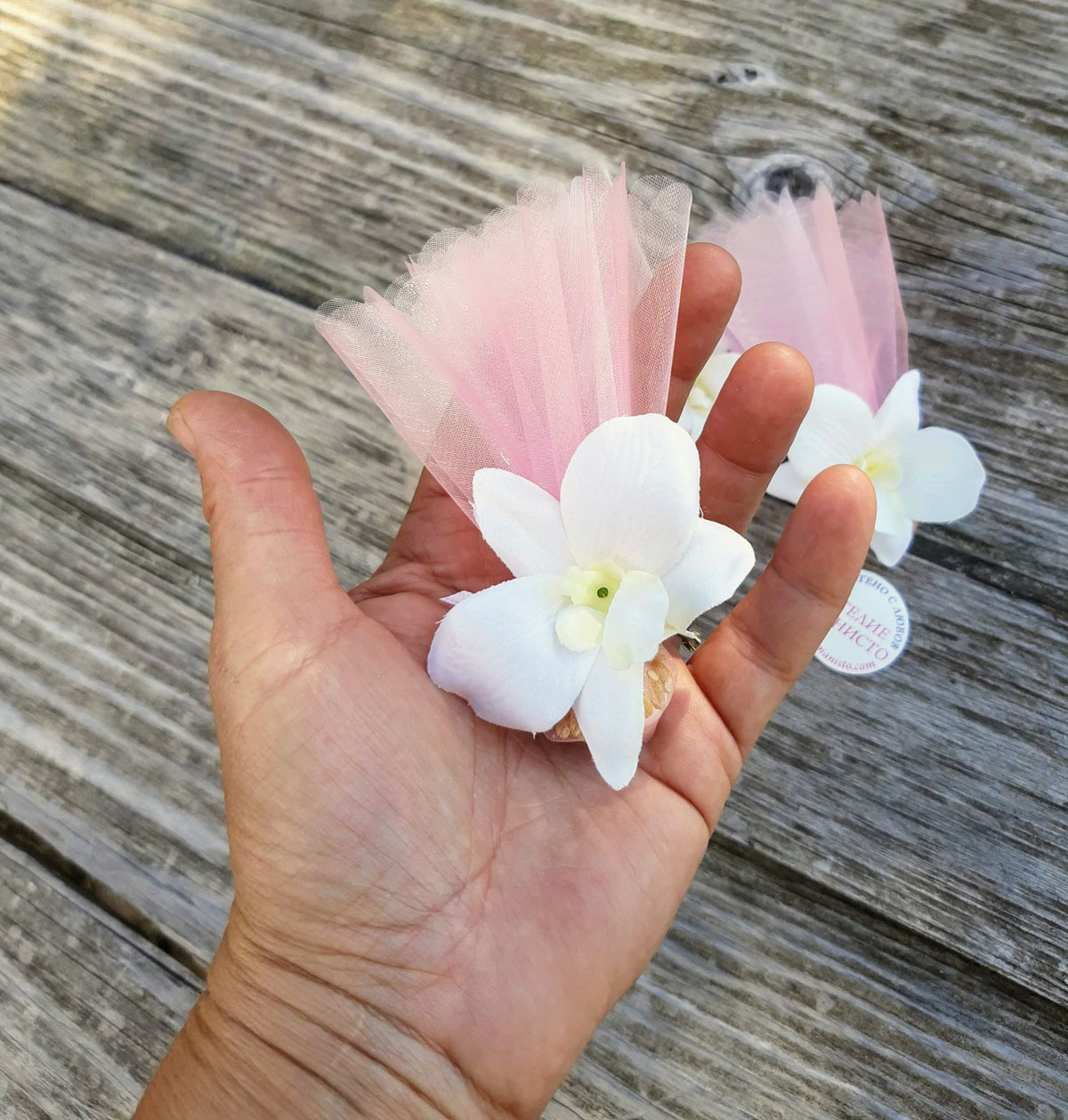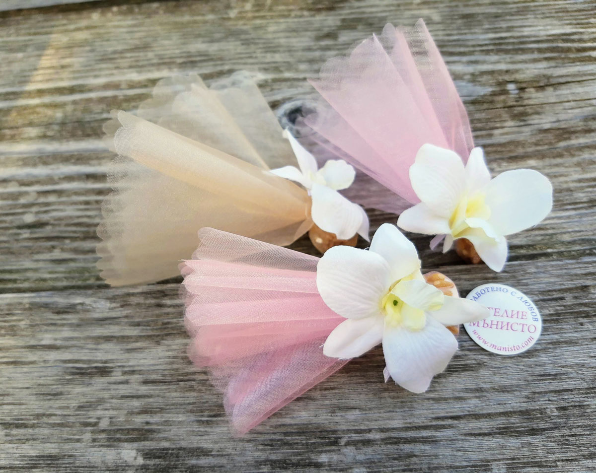 Късметчето Орхидея макси се изработва с различни цветове органза. Съдържа жито, стотинка и бонбон.