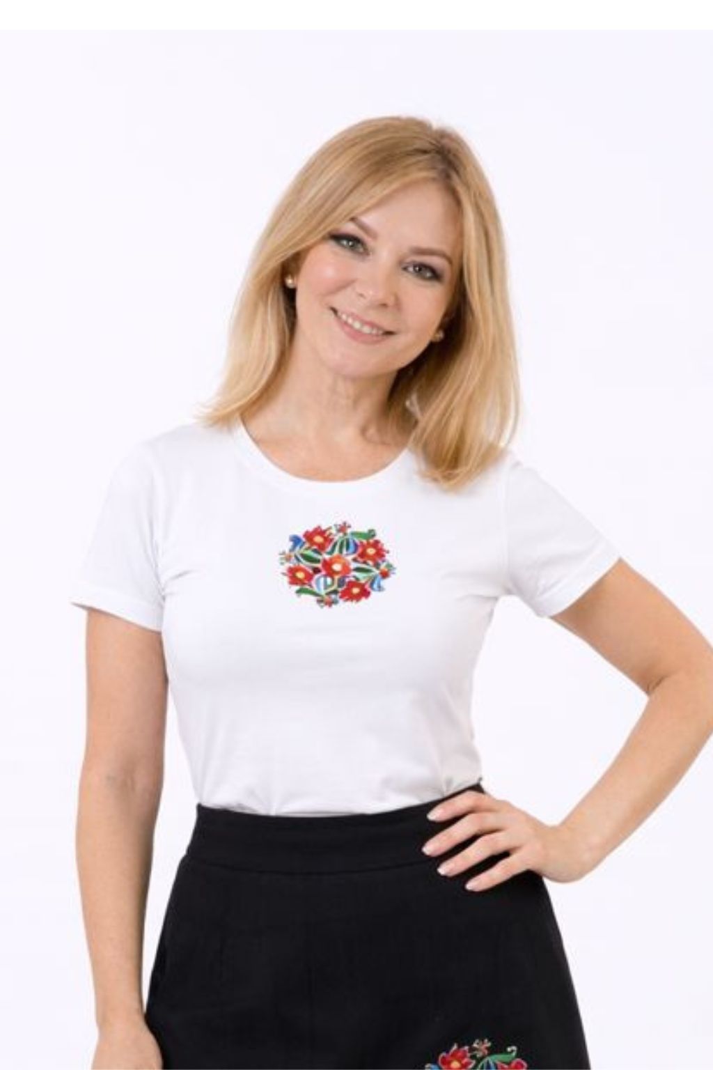 Изразителна многоцветна шевица краси линията на гърдите и носи своя енергиен заряд