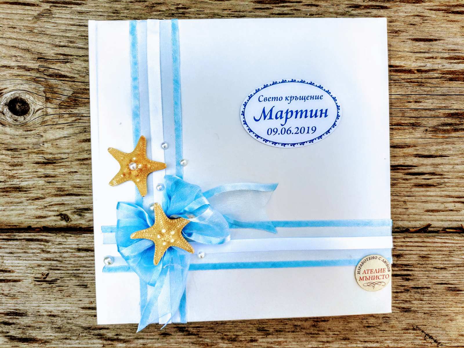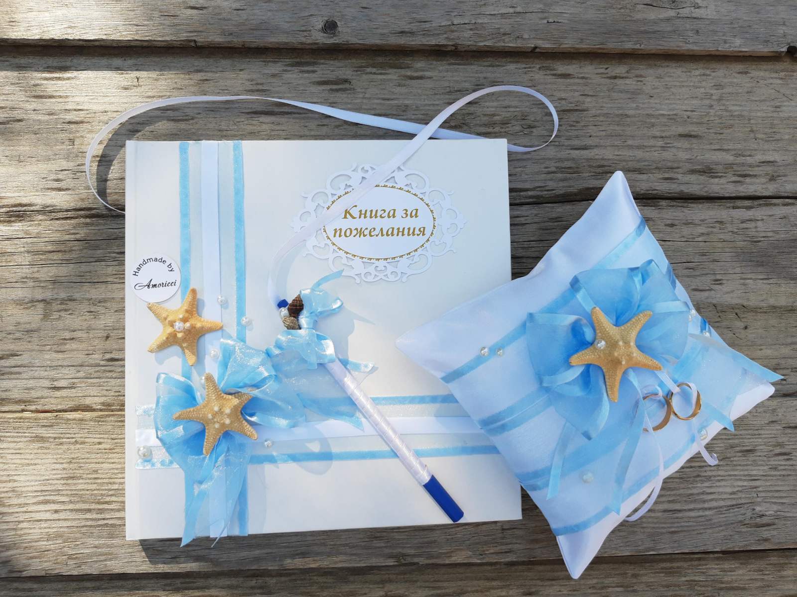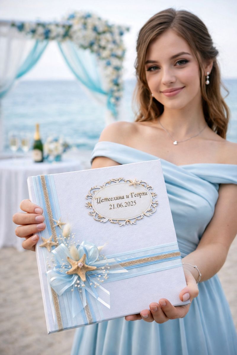 Превърнете един от най-важните моменти във Вашия сватбен ден в още по-специален спомен с този ръчно декориран сватбен химикал в морски стил. Той допълни церемонията по подписване с елегантност, романтика и индивидуален характер.