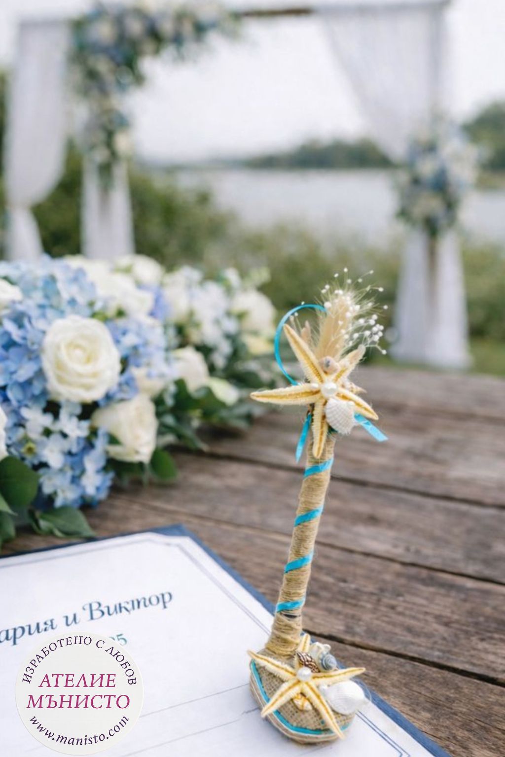 Химикалът е декориран с естествени морски елементи – морска звезда, миди, перли, юта и сатенена панделка в нежно синьо, което го прави идеален за морска, рустик или бохо сватба. Поставката осигурява стабилност и завършен, стилен вид на официалната маса.