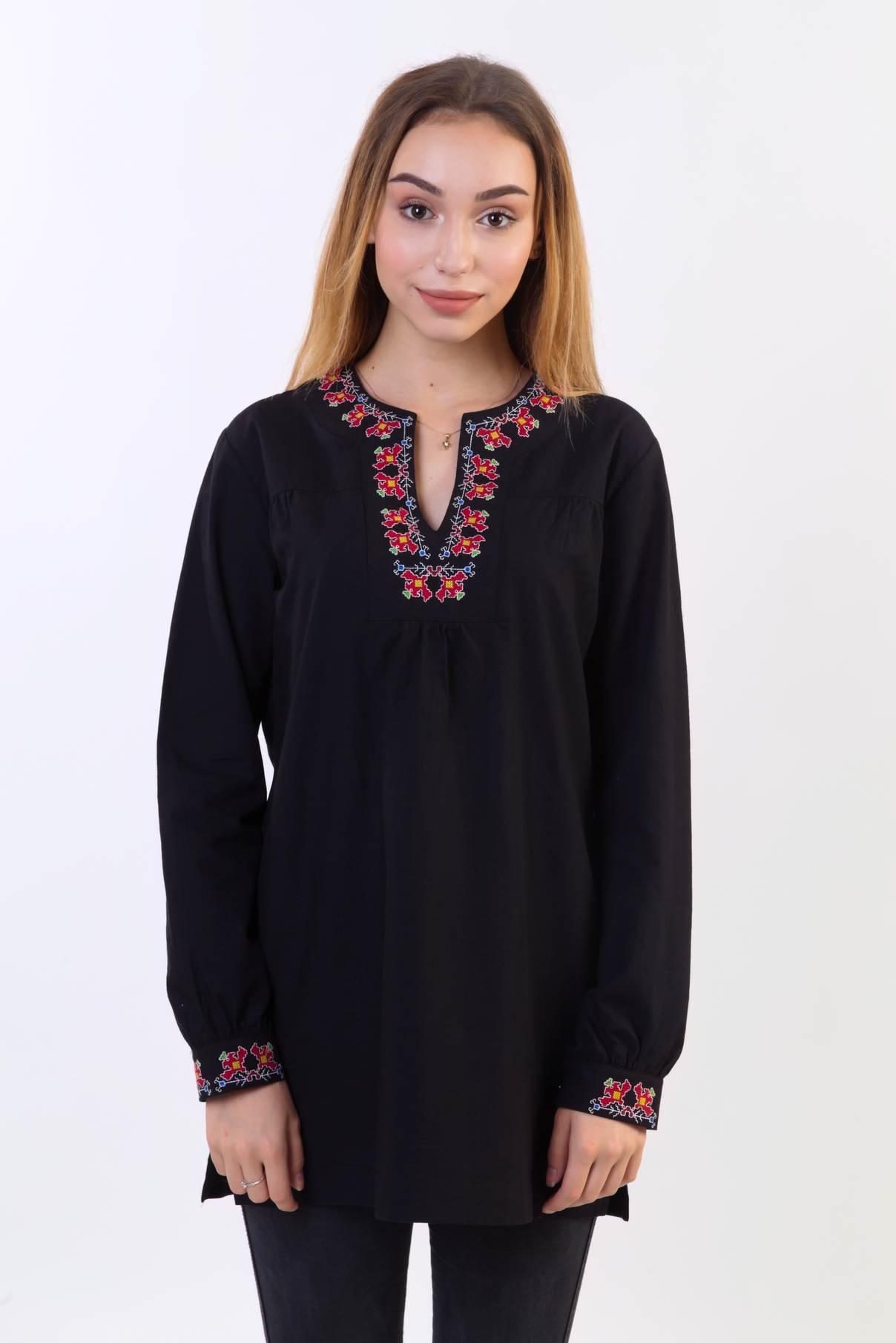 Дамска черна туника с удължен силует, завършва с цепки в страничните шевове. Деколтето е оформено с V-образна форма. Ръкавите са дълги, завършват с маншети. В горната част на ризата има платки, под които за допълнителен комфорт има и лек набор. По деколтето и на маншетите има избродирани нежни тракийски флорални шевици.