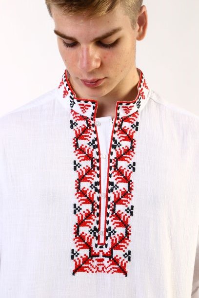Мъжка бяла риза с дълъг ръкав, завършващ с маншет. Богата двуцветна бродерия (изработена с вълнени конци) с шопски шевици, разположена по яката, деколтето, ръкавите и маншетите.